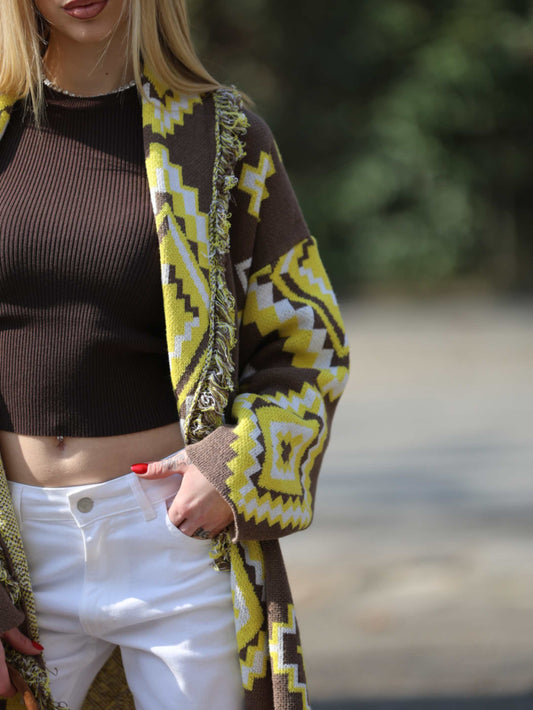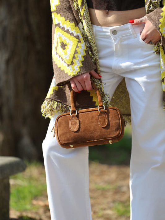 Vicolo - Top smanicato marrone e cardigan | Have One - Jeans bianco | Ovye - Texano marrone | J. Dembar - Borsa